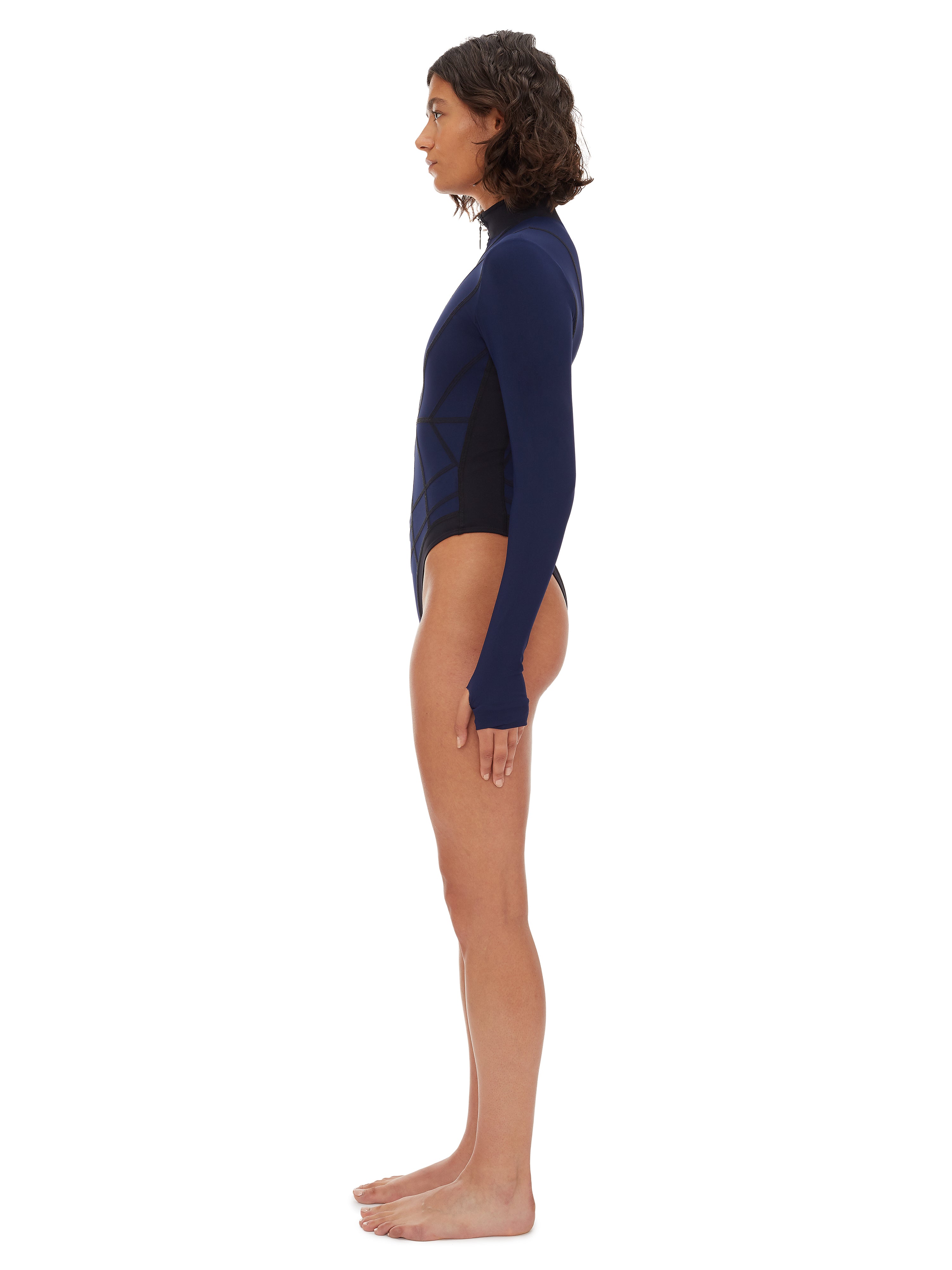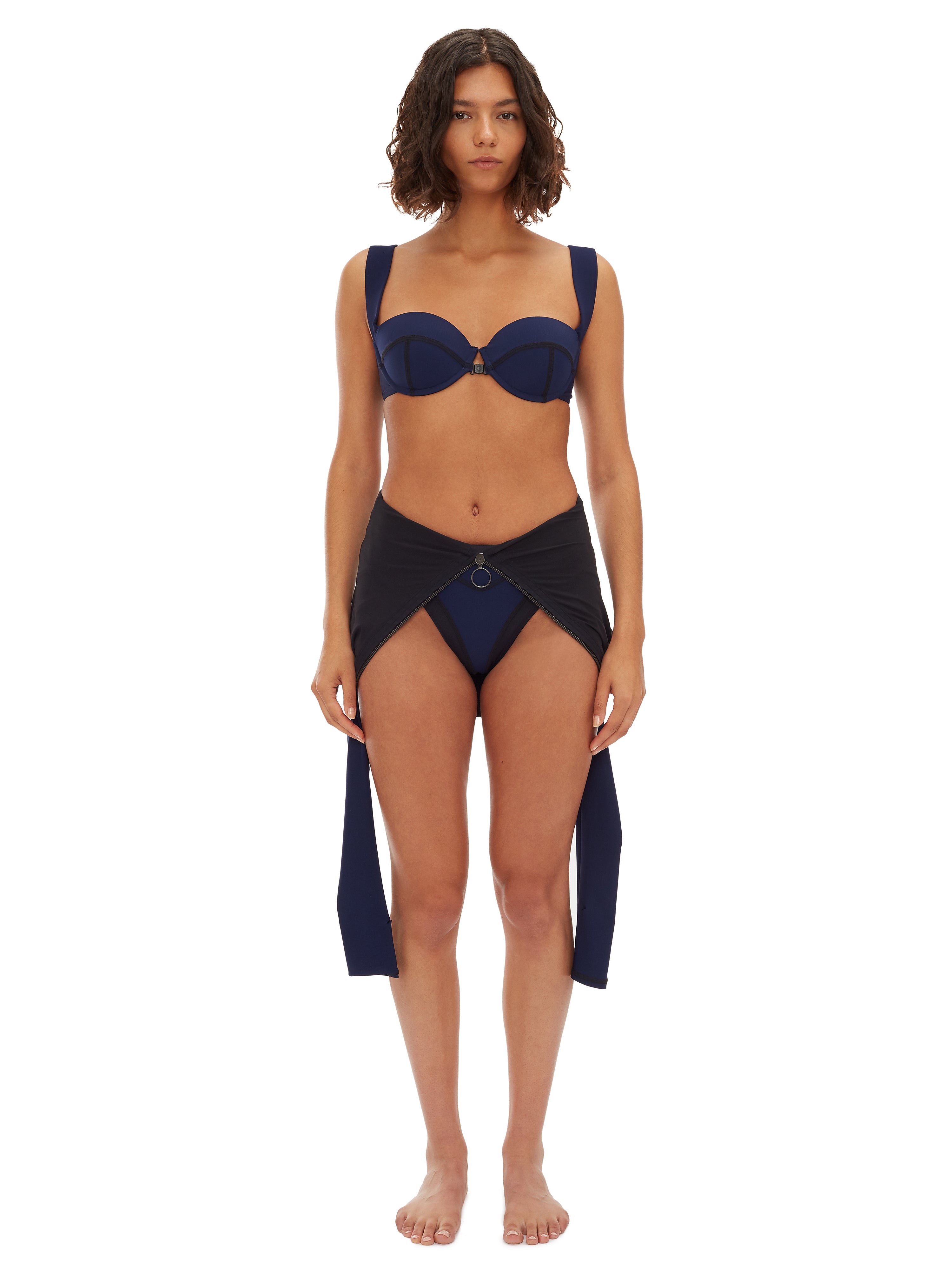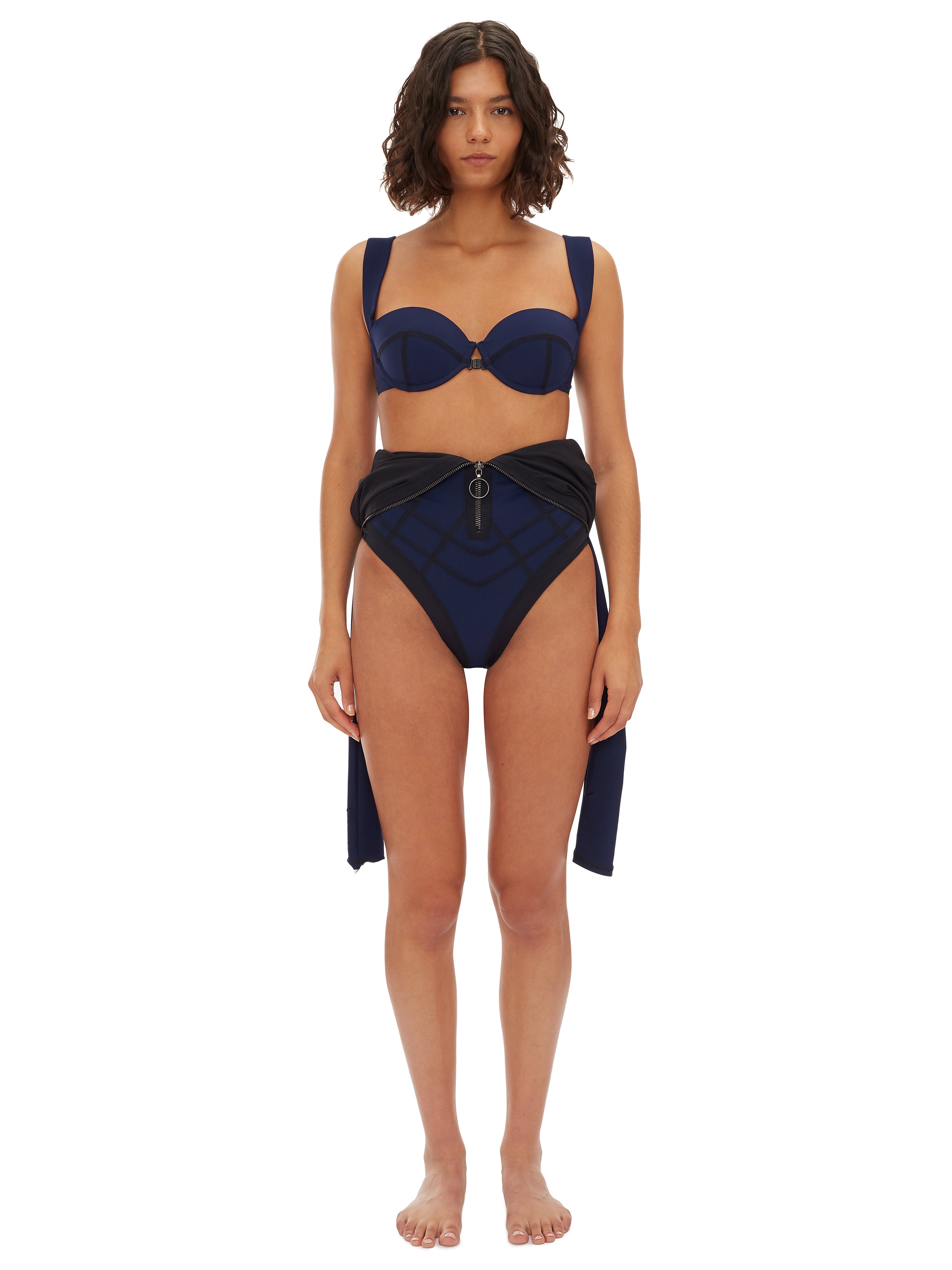 Zip-front halter one-piece. Tailored in Italian control-sculpt fabric with signature stitching and a padded underwire balconette for lift and shape.