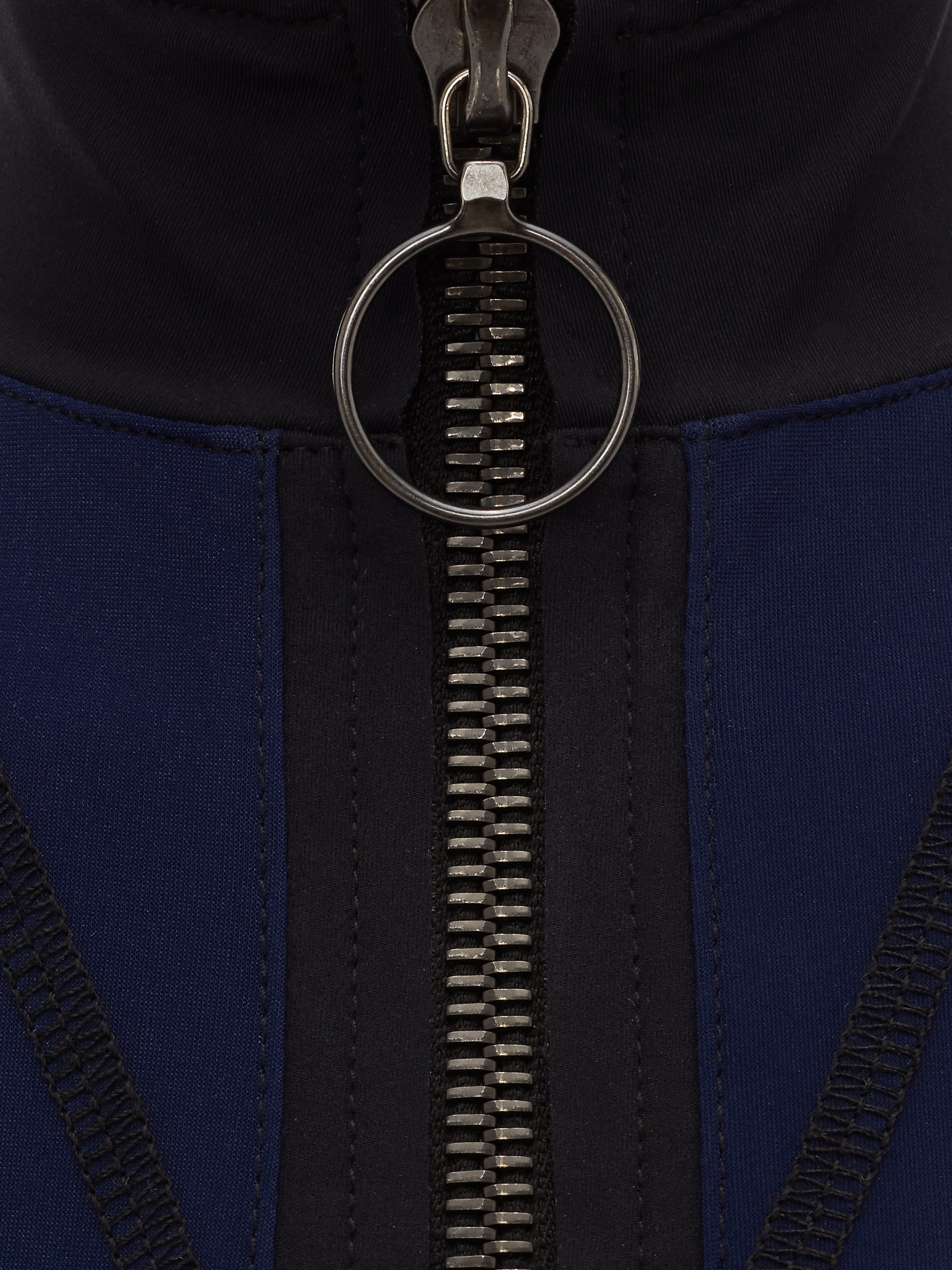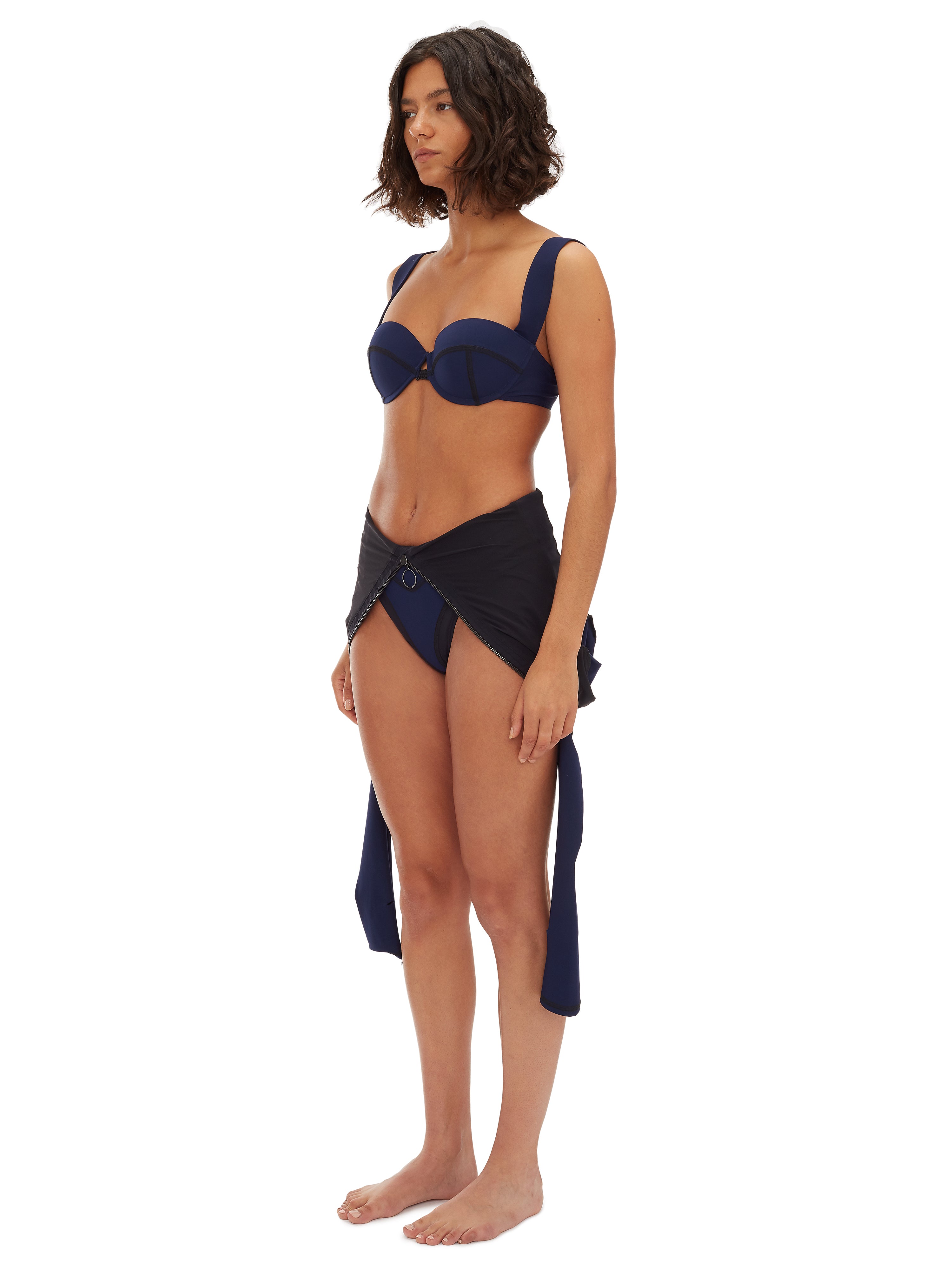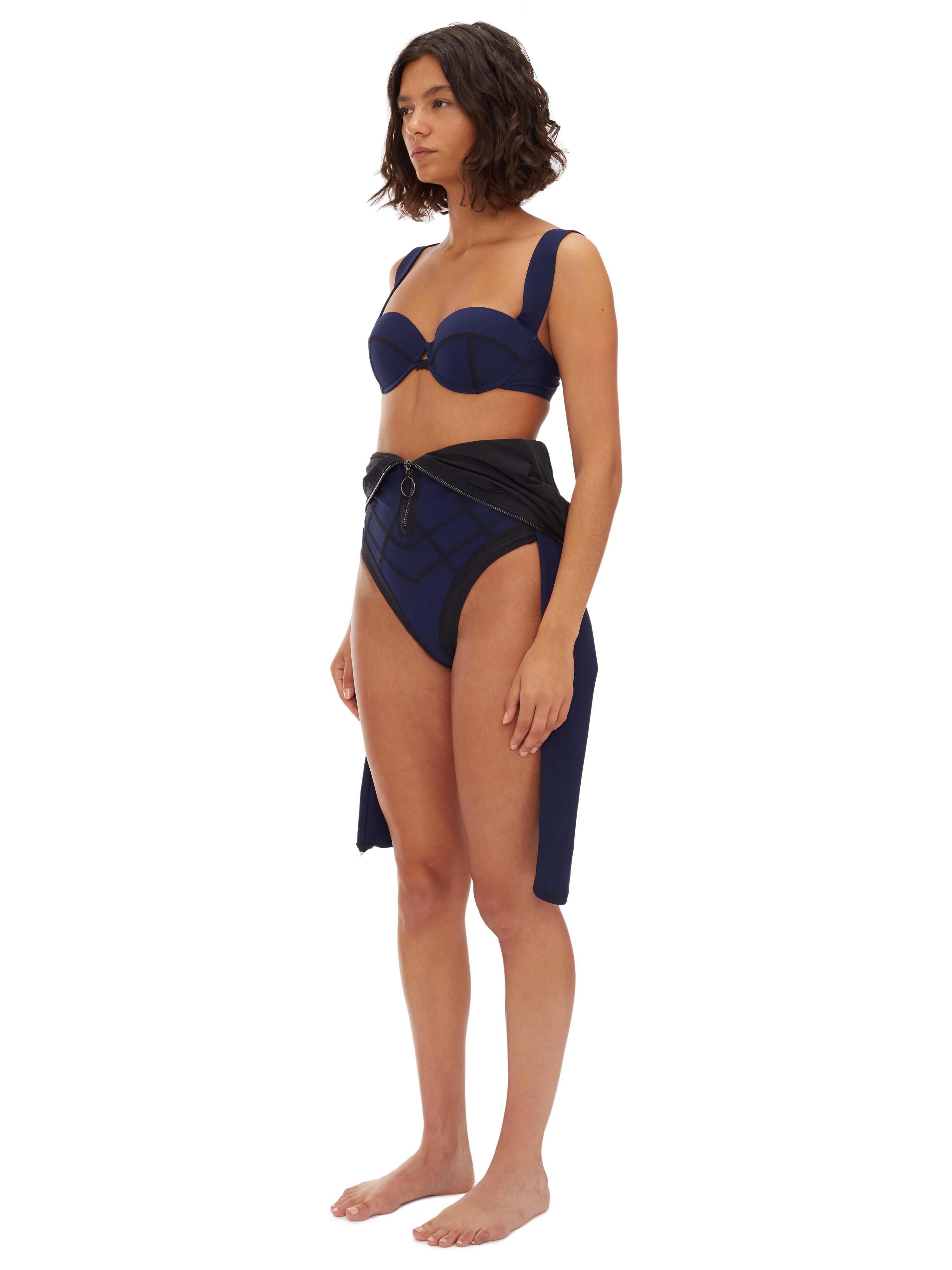 Zip-front halter one-piece. Tailored in Italian control-sculpt fabric with signature stitching and a padded underwire balconette for lift and shape.